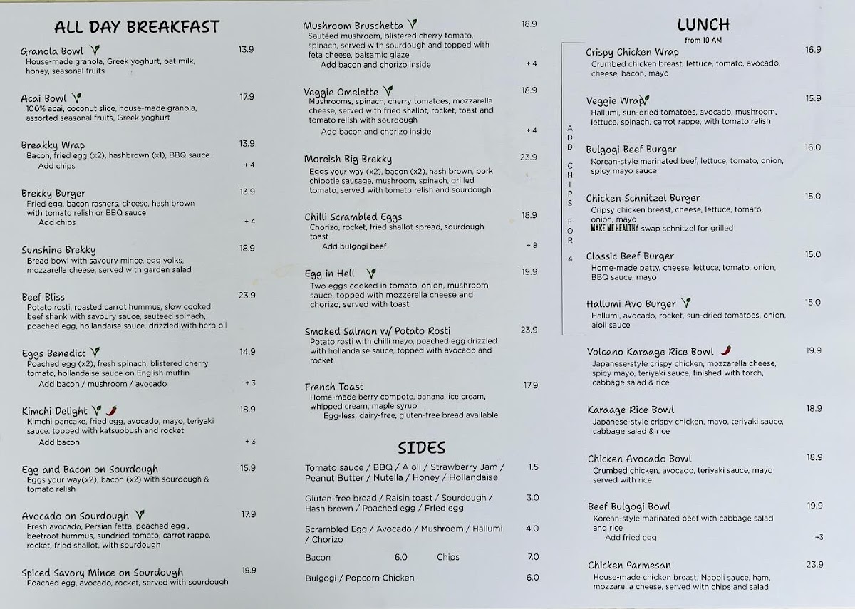Vegetarians will also find comfort with the beautifully crafted Vegetable Side Mains, featuring the rich flavors of rosemary mushrooms and the vibrant notes of avocado. And let’s not forget the selection of freshly baked Breads, perfect for a light snack or accompaniment—something as simple as warm sourdough can elevate your experience at Moreish.